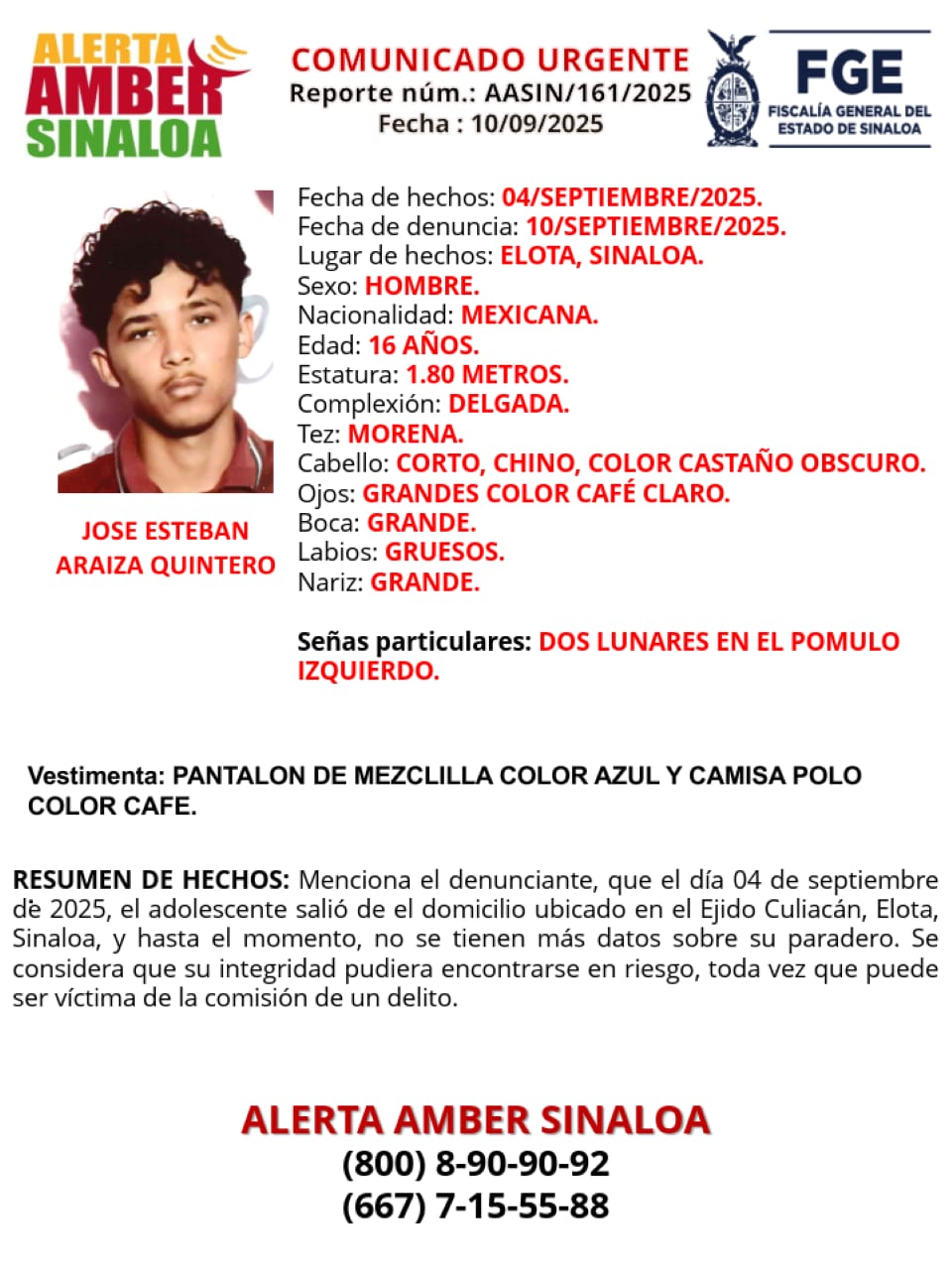 Home / Estatal / 🚨🔍🔔 #FiscalíaSinaloa solicita la colaboración ciudadana para localizar a José Esteban Araiza Quintero.Estatal🚨🔍🔔 #FiscalíaSinaloa solicita la colaboración ciudadana para localizar a José Esteban Araiza Quintero.11 septiembre, 2025Share this ArticlePrevious Article“Autoridades intensifican operativos para retirar polarizados en Culiacán”Next ArticleMujer es asesinada en el arco de CuliacáncitoGMRVSomos una productora de noticias que nos caracterizamos por informar veraz y oportunamente a nuestros seguidores. Related Posts Esta mañana, el Secretario de Seguridad Pública y Tránsito Munici ... 5 febrero, 2026 FGE informa de los hechos delictivos registrados el lunes 02 de f ... 3 febrero, 2026 FGE informa de los hechos delictivos registrados el miércoles 28 ... 29 enero, 2026 Deje un comentario Cancelar respuestaTu dirección de correo electrónico no será publicada. Los campos obligatorios están marcados con *ComentarioNombre * Correo electrónico * Web Guardar mi nombre, correo electrónico y sitio web en este navegador para la próxima vez que haga un comentario.