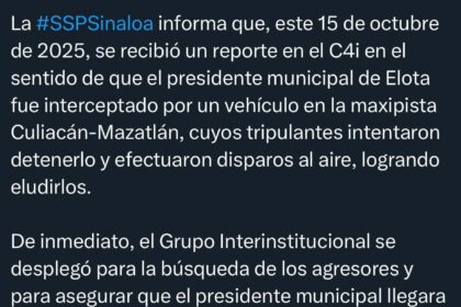 Culiacán, Sinaloa.– Esta tarde se reportó un ataque armado contra el presidente municipal de Elota, Richard Millán Vázquez, mientras circulaba en su camioneta sobre la carretera Culiacán-Mazatlán, a l...