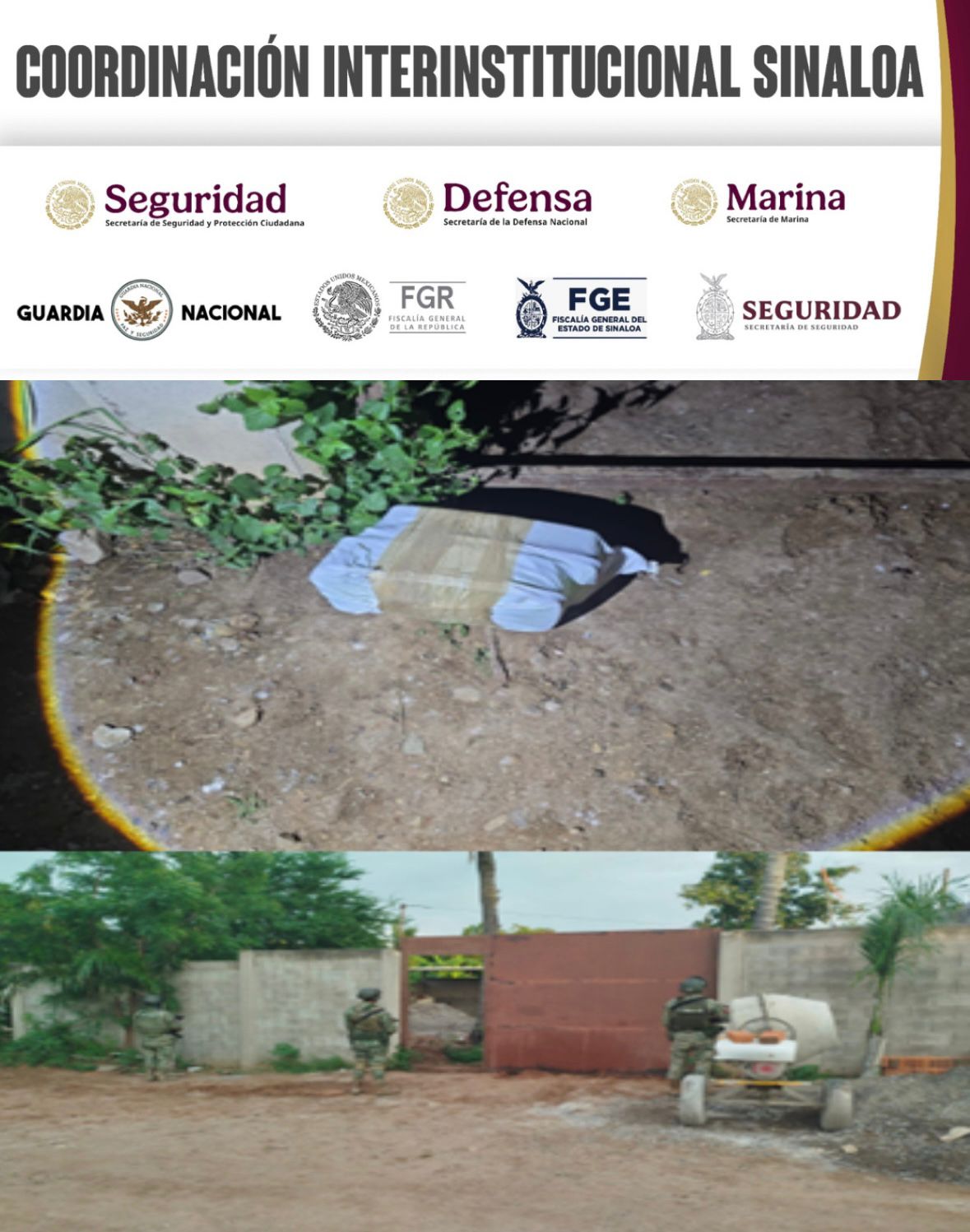 Elementos del Ejército Mexicano, en coordinación con la Guardia Nacional, la Secretaría de Marina, la Secretaría de Seguridad y Protección Ciudadana, la Fiscalía General de la República, la Fiscalía General del Estado y la Secretaría de Seguridad Pública de Sinaloa, a través de la Policía Estatal Preventiva, aseguraron un inmueble y distintas drogas en el municipio de Culiacán.