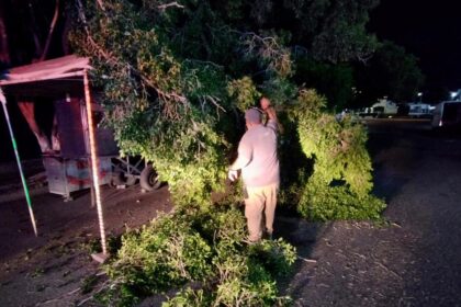 Elementos de la Coordinación Municipal de Protección Civil de Culiacán atienden los reportes de tres árboles, dos luminarias y un anuncio vial caídos en diferentes sectores de la ciudad, debido a los ...