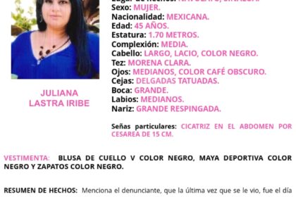 Navolato, Sinaloa.– La Fiscalía General del Estado de Sinaloa emitió una ficha de búsqueda para localizar a Juliana Lastra Iribe, de 45 años, quien fue presuntamente privada de la libertad el pasado l...