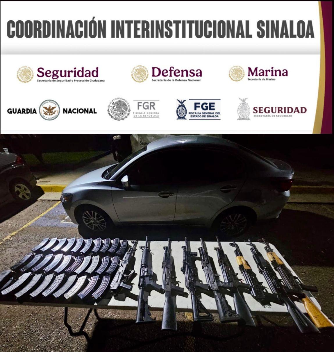 Elementos de la Secretaría de Seguridad Pública de Sinaloa, a través de la Policía Estatal Preventiva, en coordinación con el Ejército Mexicano, la Guardia Nacional, la Secretaría de Marina, la Secretaría de Seguridad y Protección Ciudadana, la Fiscalía General de la República y la Fiscalía General del Estado, aseguraron un vehículo robado, armamento y municiones en el municipio de Culiacán.