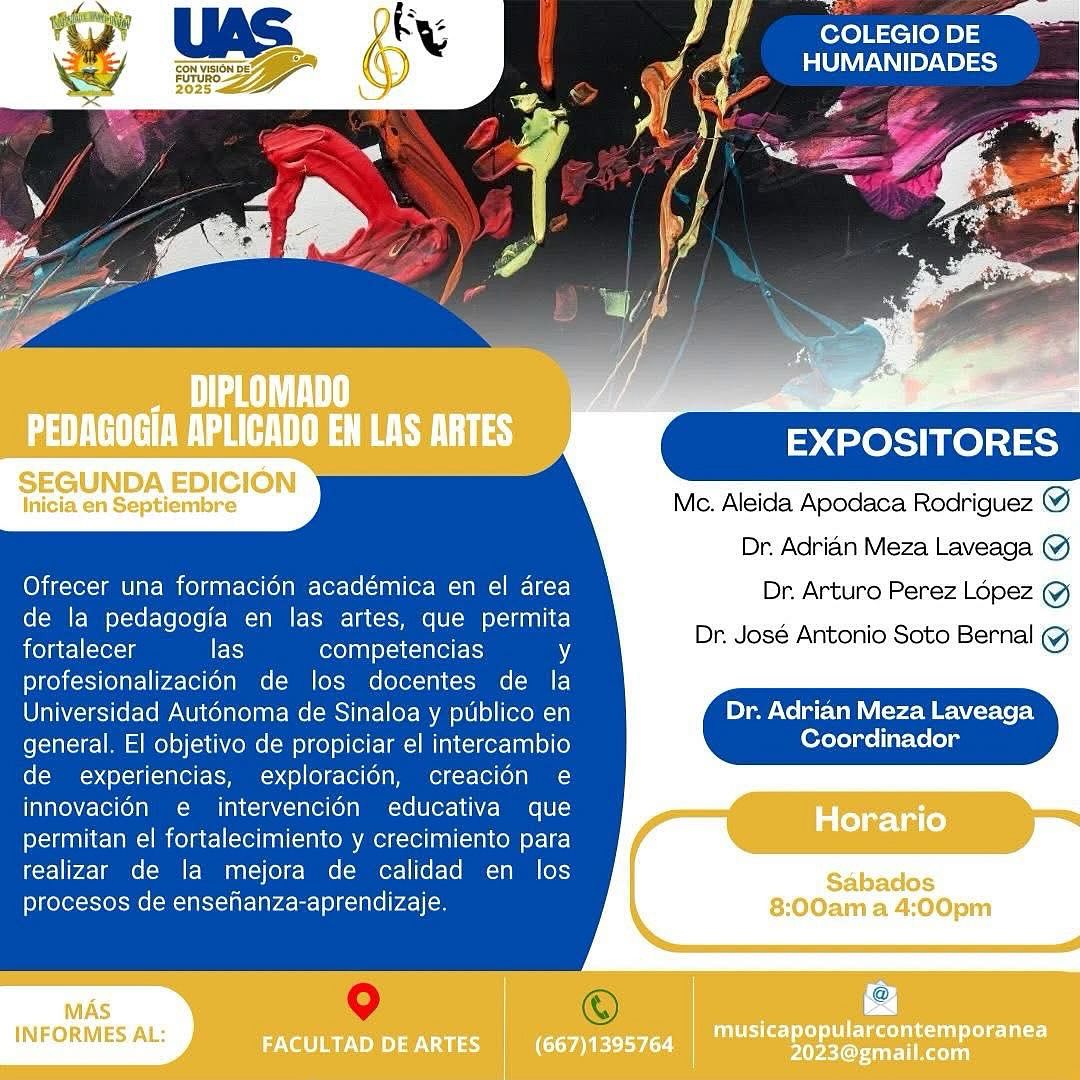 La Universidad Autónoma de Sinaloa (UAS) a través de la Facultad de Artes invita al Colegio de Humanidades a tomar el Diplomado “Pedagogía aplicada en las Artes” del 27 de septiembre al 31 de enero de 2026.